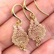 シルクミシン糸の手編みレースアクセサリー。柿渋で染めたレースアクセサリーはメタルのような印象で男性にも人気です。