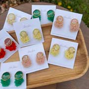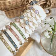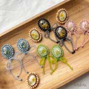 ふんわりと編んだビーズパーツや、お花を樹脂でやさしく閉じ込めたパーツなど、一つひとつ丁寧に手作業で仕立てています。
